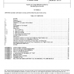 This recommended practice applies to vibration monitoring systems for rotorcraft and fixed-wing drive trains, airframes, propulsion systems, electric power generators, and flight control systems. It addresses all aspects of metrics, including what to measure, how to measure, and how to evaluate the results.