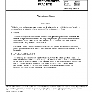 This SAE Aerospace Recommended Practice (ARP) provides guidance for the design and location of flight attendant stations, including emergency equipment installations at or near such stations, so as to enable the flight attendant to function effectively in emergency situations, including emergency evacuations.