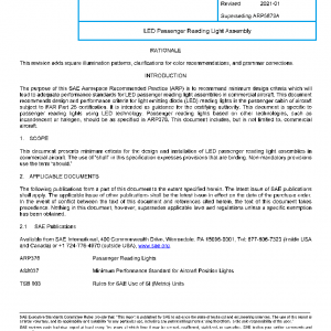 This document presents minimum criteria for the design and installation of LED passenger reading light assemblies in commercial aircraft. The use of “shall” in this specification expresses provisions that are binding. Non-mandatory provisions use the term “should.”