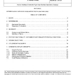 This document sets forth functional and design recommendations concerning the human factors issues and criteria for flight deck display of surface operations information. It is assumed that the system will have a human centered design based on the “lessons learned” from past systems, with simple operation, consistent performance, and intuitive use, without negative transfer of information. The visual and aural characteristics are covered for both the alerting components and surface operations display components. The display system may contain any one or a combination of these components. Although the system functionality assumed for this document exemplifies fixed-wing aircraft implementation, the recommendations do not preclude other aircraft types. The recommendations contained in this document address both near- and far-term technology directed toward providing information used during surface operations, although the present version remains primarily focused on near-term applications. Since this type of document provides only “best practice” recommendations, the guidance is provided in the form of “should” statements as opposed to the “shall” statements that appear in standards and requirements types of documents.