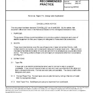 The purpose of these recommendations is to provide a guide to designers and users of electric equipment for the use of taper pins designed to make electrical connections. These recommendations cover the use of taper pins in taper pin terminal blocks, multi-contact electric connectors, and components designed to accept taper pins. Taper pins are intended to facilitate terminations of a wire and are not to be employed as a quick-disconnect device.