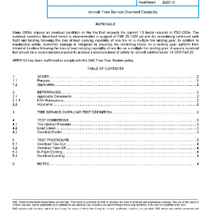 This SAE Aerospace Recommended Practice (ARP) defines a procedure for demonstrating service overload capability for new, main and nose landing gear, radial or bias tires fitted on multiple wheel landing gear of Part 25 certified aircraft.