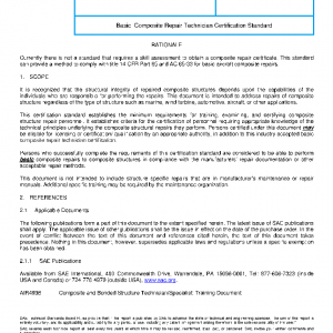 This certification standard establishes the minimum requirements for training, examining, and certifying composite structure repair personnel. It establishes criteria for the certification of personnel requiring appropriate knowledge of the technical principles underlying the composite structural repairs they perform. Persons certified under this document may be eligible for licensing or certification/ qualification by an appropriate authority, in addition to this industry accepted basic composite repair technician certification.