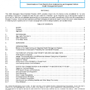 This ARP provides insights on how to perform a cost benefit analysis (CBA) to determine the return on investment that would result from implementing an integrated Health Management (HM) system on an air vehicle. The word “integrated” refers to the combination or “roll up” of sub-systems health management tools to create a platform centric system. The document describes the complexity of features that can be considered in the analysis, the different tools and approaches for conducting a CBA and differentiates between military and commercial applications. This document is intended to help those who might not necessarily have a deep technical understanding or familiarity with HM systems but want to either quantify or understand the economic benefits (i.e., the value proposition) that a HM system could provide. Prognostics is a capability within some HM systems that provides an estimation of remaining useful life (RUL) or time to failure and so Prognostic Health Management (PHM) is used where this predictive element exists. IVHM refers to an integrated vehicle level system deployed on a fleet of platforms and might, but not necessarily, include predictive elements.