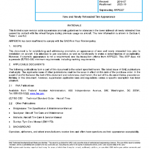 This document is for establishing and addressing anomalies on appearance of new and newly retreaded tires prior to installation on aircraft. It is intended to use cosmetics as well as functionality to make a determination of acceptability. However, if cosmetic appearance is not a requirement, use the inspection criteria from ARP6225. This ARP does not supersede (E)TSO-C62 minimum requirements, including marking requirements.