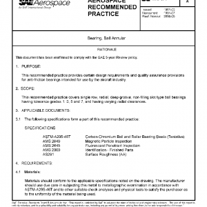 This recommended practice covers single row, radial, deep groove, non-filling slot type ball bearings having tolerance grades 1, 3, 5 and 7, and having varying radial clearances.
