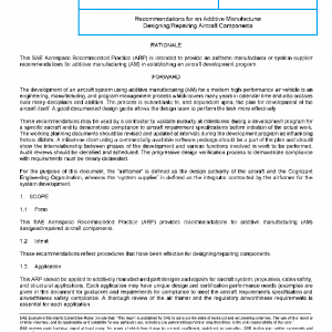 This SAE Aerospace Recommended Practice (ARP) provides recommendations for additive manufacturing (AM) designed/repaired aircraft components.