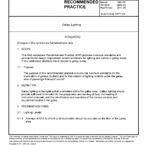 This SAE Aerospace Recommended Practice (ARP) provides minimum standards and environmental design requirement recommendations for lighting and control in galley areas. It also addresses electrical shock hazard in galley areas.