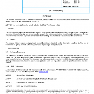 This SAE Aerospace Recommended Practice (ARP) provides minimum standards and environmental design requirement recommendations for lighting and control in galley areas. It also addresses electrical shock hazard in galley areas. The use of “shall” in this document expresses provisions that are binding. Non-mandatory provisions use the term “should.”