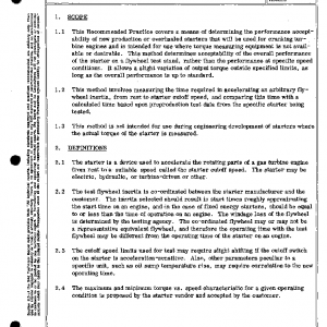 This Recommended Practice covers a means of determining the performance acceptability of new production or overhauled starters that will be used for cranking turbine engines and is intended for use where torque measuring equipment is not available or desirable. This method determines acceptability of the overall performance of the starter on a flywheel test stand, rather than the performance at specific speed conditions. It allows a slight variation of output torque outside specified limits, as long as the overall performance is up to standard.