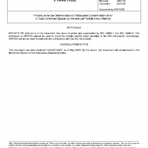 This document has been decalred “CANCELLED” as of May 2010. By this action, this document will remain listed in the Numercial Section of the Aerospace Standards Index.This SAE Aerospace Recommended Practice (ARP) describes two procedures for sampling particles in dust controlled spaces. One procedure covers airborne dust above 5 μm. The other (and newly added procedure) covers particles of 25 μm and larger that “fall out” of the environment onto surfaces. In each case the particles are sized in the longest dimension and counted. Airborne particles are reported as particles per cubic meter (cubic foot) whereas particles collected in fall out samples are reported as particles per 0.1 square meter (square foot). This document includes English units in parentheses as referenced information to the SI units where meaningful.