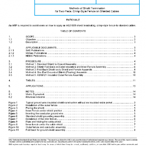 AS21608 shield terminating, crimp-style ferrule applications on shielded cables require various piece parts in multiple combinations to ground the shield of non-environmental cables. This ARP provides the recommended methods to ensure the shield ground wire is terminated correctly and the shield is protected. Refer to AS83519 for shield grounding when eviornmental resistance is required.