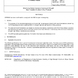 The purpose of this recommended practice is to provide the aerospace industry with recommendations concerning minimizing stress-corrosion cracking (SCC) in wrought high-strength aluminum alloy products.