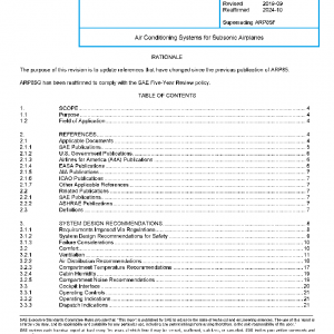 This SAE Aerospace Recommended Practice (ARP) contains guidelines and recommendations for subsonic airplane air conditioning systems and components, including requirements, design philosophy, testing, and ambient conditions.