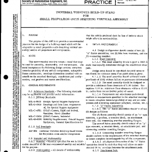 This recommended practice covers a stand that may be used for assembly, disassembly, and maintenance. The stand incorporates the following design criteria: complete interchangeability of any and all components, collapsible frame construction, envelope dimensions (marked with an asterik on the attached drawings), attachment pad configuration, and gearbox and caster specifications.
