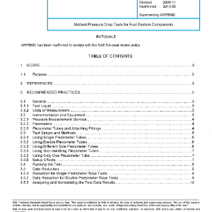 This document provides recommended methods and describes associated equipment and test setups to assist in understanding and conducting pressure drop tests on fuel system components. Background information and suggestions are provided as means of improving accuracy and repeatability of test results. Although written specifically for fuel system components, the methods, equipment and suggestions presented herein apply equally to pressure drop tests of other liquid-handling devices.