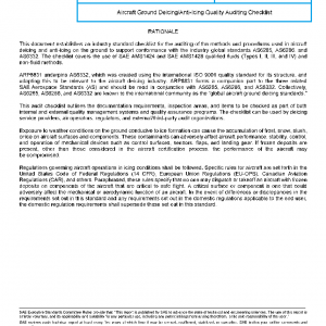 This document establishes an industry standard checklist for the auditing of the methods and procedures used in aircraft deicing and anti-icing on the ground to support conformance with the industry global standards, AS6285, AS6286 and AS6332. The checklist covers the use of SAE AMS1424 and SAE AMS1428 qualified fluids (Types I, II, III, and IV) and non-fluid methods.