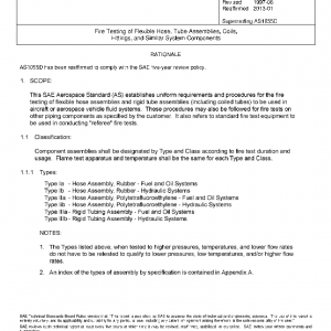 This SAE Aerospace Standard (AS) establishes uniform requirements and procedures for the fire testing of flexible hose assemblies and rigid tube assemblies (including coiled tubes) to be used in aircraft or aerospace vehicle fluid systems. These procedures may also be followed for fire tests on other piping components as specified by the customer. It also refers to standard fire test equipment to be used in conducting “referee” fire tests.