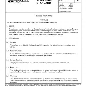 This standard provides a method for the application of surface finish control primarily to aircraft engine and propeller parts. Recommendations for a Surface Roughness Standard are contained in A.S.A. publication B46 and this S.A.E. Aeronautical Standard contains a summary of information therein plus other information which has been compiled from current manufacturing practice.