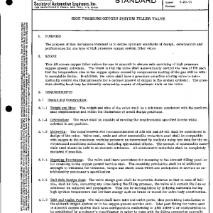 This AS covers oxygen filler valves for use in aircraft to ensure safe servicing of high pressure oxygen system cylinders. The intent is that the valve shall automatically control the rate of fill such that the temperature rise in the oxygen system caused by compression heating of the gas will be within acceptable limits. In addition, the valve shall have a pressure sensitive closing valve to automatically control the final pressure for a correct amount of oxygen in the system cylinder. The pressure closing level may be manually selected by means of adjustment dials on the valve.
