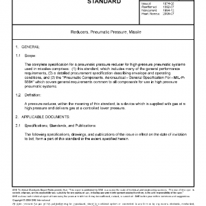 The complete specification for a pneumatic pressure reducer for high pressure pneumatic systems used in missiles comprises: (1) this standard, which includes many of the general performance requirements, (2) a detailed procurement specification describing envelope and operating conditions, and (3) the “Pneumatic Components, Aeronautical – General Specification For – MIL-P-8564” which covers general requirements common to all components for use in high pressure pneumatic systems.