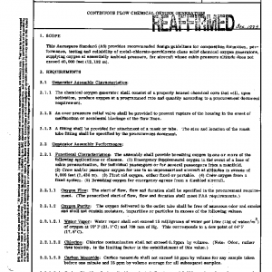 This Aerospace Standard (AS) provides recommended design guidelines for composition formation, performance, testing and reliability of metal-chlorate-perchlorate class solid chemical oxygen generators, supplying oxygen at essentially ambient pressure, for aircraft whose cabin pressure altitude does not exceed 40,000 feet (12,192 m).