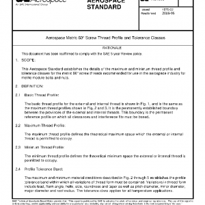 This Aerospace Standard establishes the details of the maximum and minimum thread profile and tolerance classes for the metric 60° screw threads recommended for use in the aerospace industry for metric module bolts and nuts.