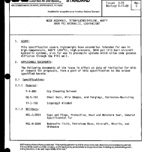 This specification covers lightweight hose assemblies intended for use in high-temperature, 400°F (204°C), high-pressure, 3000 psi (210 bar) aircraft hydraulic systems, also for use in pneumatic systems which allow some gaseous diffusion through the PTFE wall.