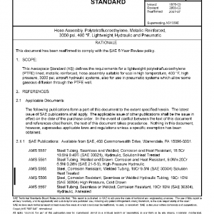 This Aerospace Standard (AS) defines the requirements for a lightweight polytetrafluoroethylene (PTFE) lined, metallic reinforced, hose assembly suitable for use in high temperature, 400 °F, high pressure, 3000 psi, aircraft hydraulic systems, also for use in pneumatic systems which allow some gaseous diffusion through the PTFE wall.