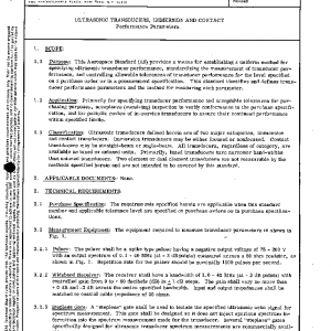 This Aerospace Standard (AS) provides a means for establishing a uniform method for specifying ultrasonic transducer performance, standardizing the measurement of transducer performance, and controlling allowable tolerances of transducer performance for the level specified on a purchase order or in a procurement specification. This standard identifies and defines transducer performance parameters and the method for measuring each parameter.