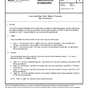 This SAE Aerospace Standard (AS) covers medium-pressure, high-temperature, flexible, metal-hose assemblies suitable for continuous operation in pneumatic systems up to 850 °F with short duration excursion to 1200 °F and primarily for use on jet aircraft power plants.
