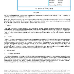 This SAE Aerospace Standard specifies the dimensional, design criteria, fabrication, performance, operational, environmental, and testing requirements for interline pallets requiring airworthiness approval for loading onto civil transport aircraft equipped with NAS3610/AS36100 restraint systems and using pallet nets meeting the requirements of AS1492. Type II/2 covers NAS3610/AS36100 code sizes. Type III pallets have been removed from this SAE Aerospace Standard revision.