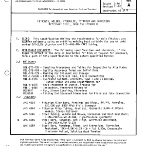 This specification defines the requirements for weld fittings and machine weldments using an orbiting welding head suitable for use on cold worked 3Al-2.5V titanium and 21Cr-6Ni-9Mn CRES tubing.