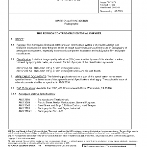 This Aerospace Standard establishes an identification system and provides design and tolerance information in describing two series of image quality indicators currently used in radiography of aerospace components, especially in electronic component evaluation and radiographic film and paper classification.