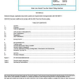 This SAE Aerospace Standard (AS) specifies the interface requirements for tow bar attachment fittings on the nose gear (when towing operations are performed from the nose gear) of conventional tricycle type landing gears of commercial civil transport aircraft with a maximum ramp weight higher than 50,000 kg (110,000 pounds), commonly designated as âmain line aircraftâ.