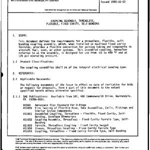 This document defines the requirements for a threadless, flexible, self-bonding coupling assembly, which, when installed on machined fixed cavity ferrules, provides a flexible connection for joining tubing and components in aircraft fuel, vent, or other systems. This assembled coupling, hereafter referred to as the assembly, is designed for use from -65 to 400 °F and at 125 psi operating pressure.
