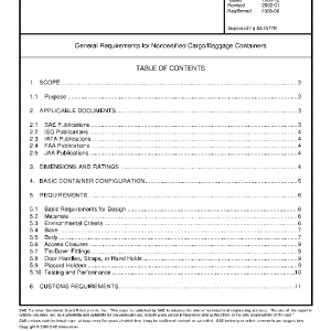 This SAE Aerospace Standard (AS) covers the requirements for lower deck containers in wide body and standard body aircraft which do not require airworthiness certification under the condition of compartment restraint and/or, where applicable according to aircraft type, NAS3610 equivalent baseplate-restraint for these containers.