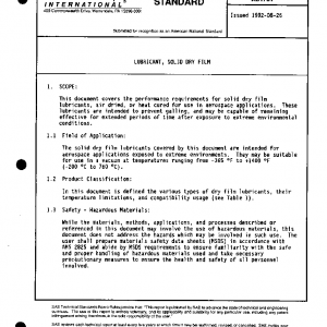This document covers the performance requirements for solid dry film lubricants, air dried, or heat cured for use in aerospace applications. These lubricants are intended to prevent galling, and may be capable of remaining effective for extended periods of time after exposure to extreme environmental conditions.