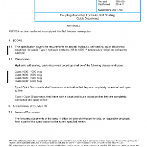 This specification covers the requirements for aircraft, hydraulic, self-sealing, quick disconnect couplings, for use in Type II hydraulic systems (-65 to +275 °F temperature range) as defined by AS5440.