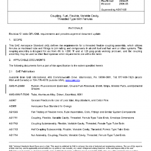 This SAE Aerospace Standard (AS) defines the requirements for a threaded flexible coupling assembly, which utilizes ferrules or machined tube end fittings to join tubing and components in aircraft fuel and fuel vent or other systems. This coupling assembly is designed for use from -65 to +200 °F and at 125 psig peak working pressure, and the coupling assembly may be used in other fluid systems when requirements are within the limits.