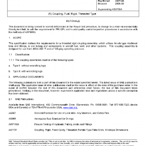 This specification defines the requirements for a threaded rigid coupling assembly, which utilizes ferrule type machined tube end fittings, to join tubing and components in aircraft fuel, vent, and other systems. This coupling assembly is designed for use from -65 to 200 °F and at 125 psig operating pressure.
