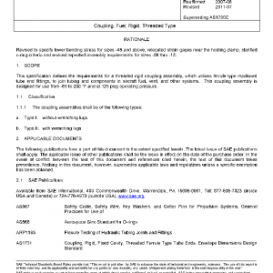 This specification defines the requirements for a threaded rigid coupling assembly, which utilizes ferrule type machined tube end fittings, to join tubing and components in aircraft fuel, vent, and other systems. This coupling assembly is designed for use from −65 to 200 °F and at 125 psig operating pressure.