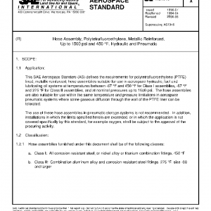This SAE Aerospace Standard (AS) defines the requirements for polytetrafluoroethylene (PTFE) lined, metallic reinforced, hose assemblies suitable for use in aerospace hydraulic, fuel and lubricating oil systems at temperatures between -67 °F and 450 °F for Class I assemblies, -67 °F and 275 °F for Class II assemblies, and at nominal pressures up to 1500 psi. The hose assemblies are also suitable for use within the same temperature and pressure limitations in aerospace pneumatic systems where some gaseous diffusion through the wall of the PTFE liner can be tolerated.