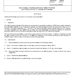 This SAE Aerospace Standard (AS) defines the requirements for polytetrafluoroethylene (PTFE) lined, metallic reinforced, hose assemblies suitable for use in aerospace hydraulic, fuel and lubricating oil systems at temperatures between -67 °F and 450 °F for Class I assemblies, -67 °F and 275 °F for Class II assemblies, and at nominal pressures up to 1500 psi. The hose assemblies are also suitable for use within the same temperature and pressure limitations in aerospace pneumatic systems where some gaseous diffusion through the wall of the PTFE liner can be tolerated.