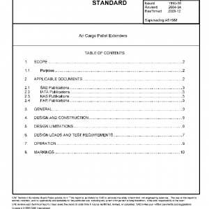 This SAE Aerospace Standard (AS) establishes the dimensional and operational requirements for pallet extension devices. It provides support for items of cargo beyond either the short or the long sides of a pallet, allowing increased volume to be achieved in conjunction with pallets meeting the requirements of AS1491 plus additional pallet sizes usable with extenders.