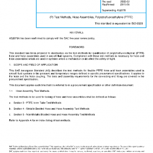 This SAE Aerospace Standard (AS) describes the test methods for flexible PTFE hose and hose assemblies used in aircraft fluid systems in the pressure and temperature ranges defined in specific procurement specifications. It applies to the hose and the hose coupling. The tests and assembly requirements for the connecting end fitting are covered in the procurement specification.