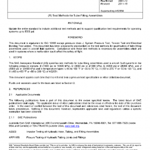 This SAE Aerospace Standard (AS) specifies test methods for tube-fitting assemblies used in aircraft fluid systems in the following pressure classes: B (1500 psi or 10500 kPa), D (3000 psi or 21000 kPa), E (4000 psi or 28000 kPa), and J (5000 psi or 35000 kPa) and in temperature types I (-65 to 160 °F or -55 to 70 °C), II (-65 to 275 °F or -55 to 135 °C), and III (-65 to 400 °F or -55 to 200 °C) of AS2001.