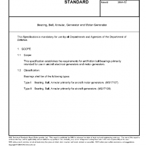 This specification establishes the requirements for antifriction ball bearings primarily intended for use in aircraft electrical generators and motor-generators.