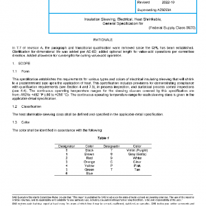 This specification establishes the requirements for various types and colors of electrical insulating sleeving that will shrink to a predetermined size upon the application of heat. This specification includes provisions for demonstrating compliance with qualification requirements (see Section 4 and 7.3), in process inspection, and statistical process control inspections (see 4.4). The continuous operating temperature ranges for the sleeving classes covered by this specification are from -112 to +482 °F (-80 to +250 °C). The continuous operating temperature range for each sleeving class is given in the applicable detail specification.