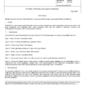 AS23190 is a procurement specification that covers a series of plastic and metal components and devices used for the tying, positioning, and supporting cable, cable assemblies, wire, and wire bundles in electrical, electronic and communication equipment, and in interconnection systems.